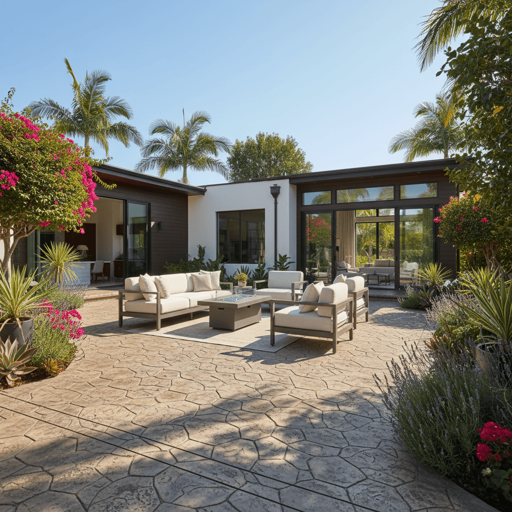 - Artistic Stamped Concrete Elevate your outdoor living spaces with our creative stamped concrete designs.
